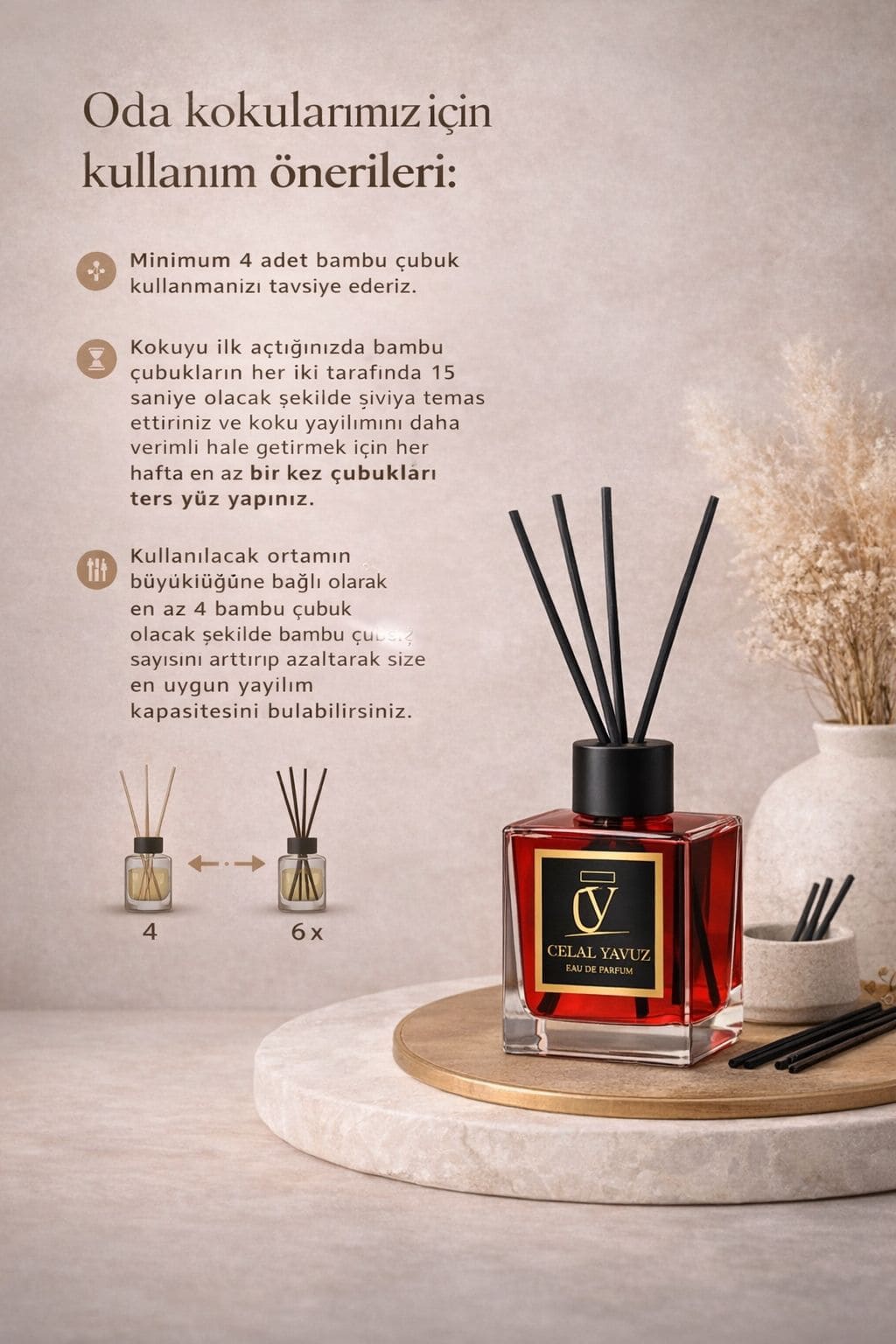 Çubuklar sayesinde koku ortama yavaş ve sürekli yayılır, bulunduğunuz alanda kalıcı ve zarif bir atmosfer oluşturur.